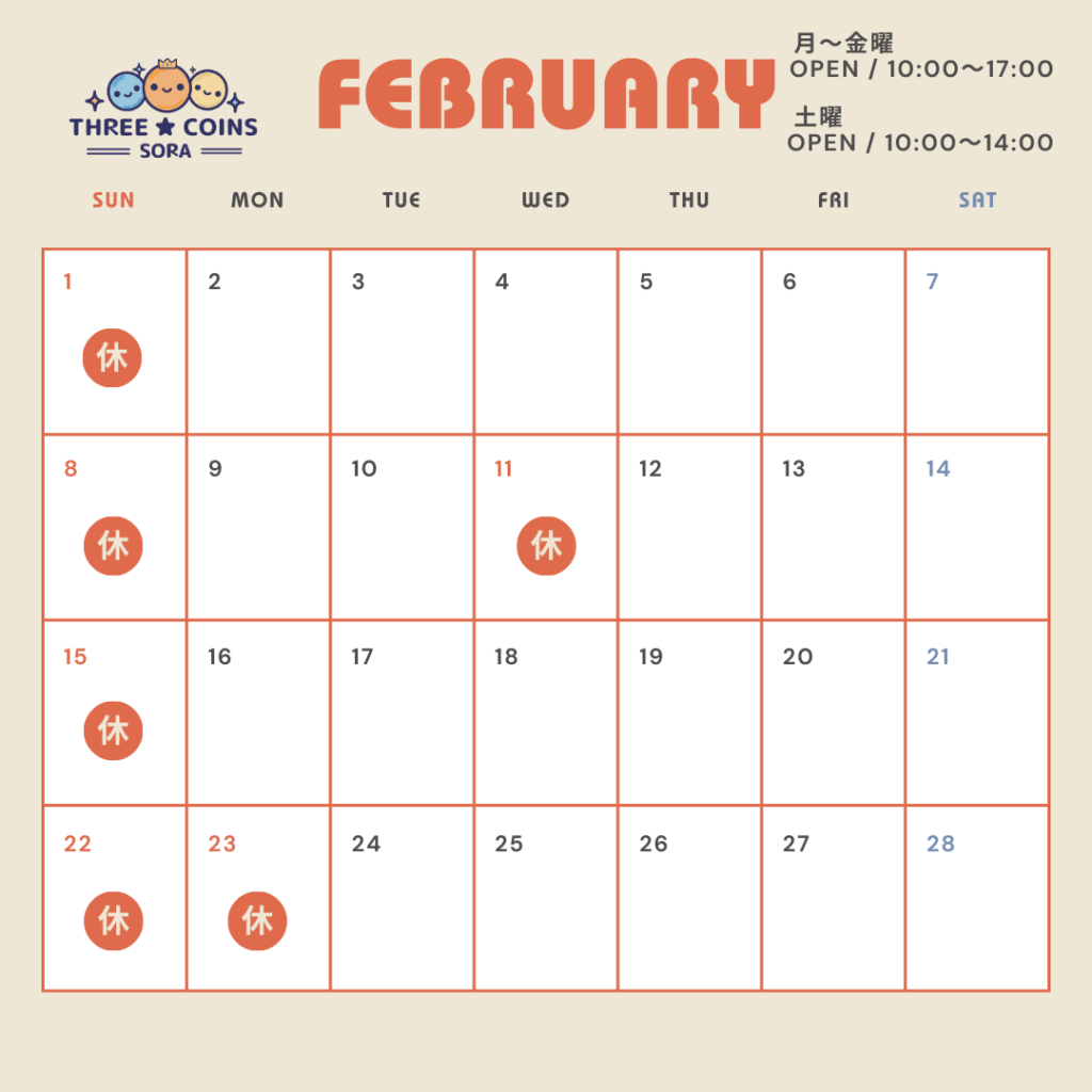 2月営業日のお知らせ 2026年2月14日 最終更新日時 : 2026年2月16日 浜松いつも当店をご利用いただきありがとうございます。スリーコインズSORAの2月の営業日をお知らせします。月~金曜10:00~17:00土曜10:00~14:00となっております。ぜひお立ち寄りください☺️\ 最新情報をチェック /